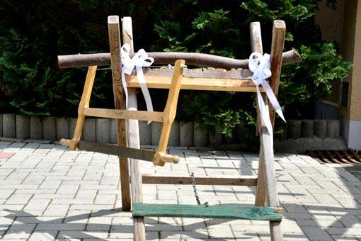 Zum Empfang Ihrer Gäste reichen wir Ihnen ein Glas Sekt und dazu arrangieren wir für Sie den Hochzeitsbrauch "Baumstammsägen" sowie "Brot, Salz & Wasser".