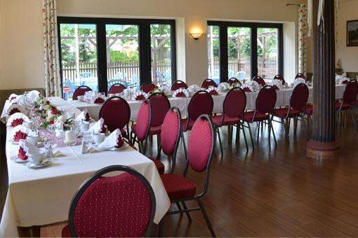 Ihre Räumlichkeit ist festlich eingedeckt, mit Blumenschmuck, Servietten, Kerzen und allem was dazu Gehört.